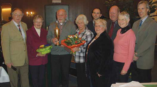 Vorsitzender Hans-Günther Zemke mit den Preisträgern Renate Zemke (Grünpreis), Jochen und Christa Hinrichs (Goldene Gartenvase) sowie den Vorstandsmitgliedern Jan-Dieter Heß, Ingrid Meyer, Werner & Eva Renken und AStOB-Vorsitzender Harald Götting (v.l.)
