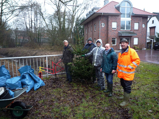 Trotz Wind & Wetter – Akutwarnung der Öffentlichen Versicherung: „Glatteisregen“ (9.3.: 9.00 Uhr bis 16.00 Uhr) unterstützten sie wieder tatkräftig die Bürgervereins-Aktion „Oldenburg räumt auf“ in Eversten. v. lks.: Helmut Ortland, Rainer Zemke, Hans Pätzold, Ralf Peters und Heinz Tenfelde, der dem städtischen Abfallwirtschaftsbetrieb und dem Bürgerverein zusätzlich einen aufklärenden „vor-Ort-Bericht“ vorlegte.
